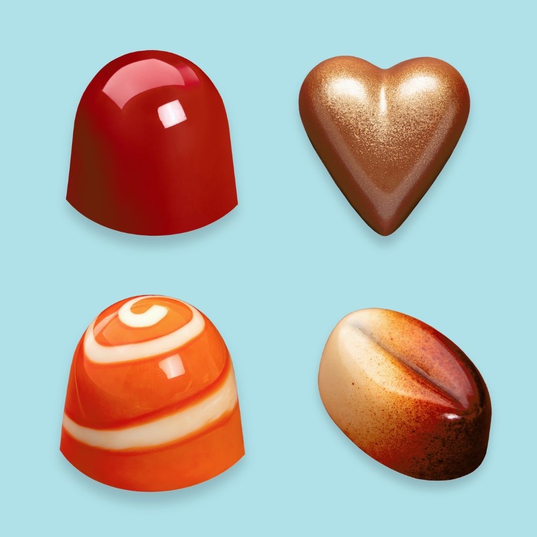 Kakaomasse (kakaobønner, sukker, kakaofett, soyalecitin, melkepulver, vaniljeekstrakt), fløte, ingefær, mango, sitron, appelsin, bringebær, kaffe, peanøtt, smør, glukose/invertsukker, sorbitol, sitronsyre, pektin, likør, salt, chili, fargestoff E102, E104, E110 og E122 kan ha en ugunstig virkning på barns aktivitet og konsentrasjon, E132, E142, E172 og E555.
