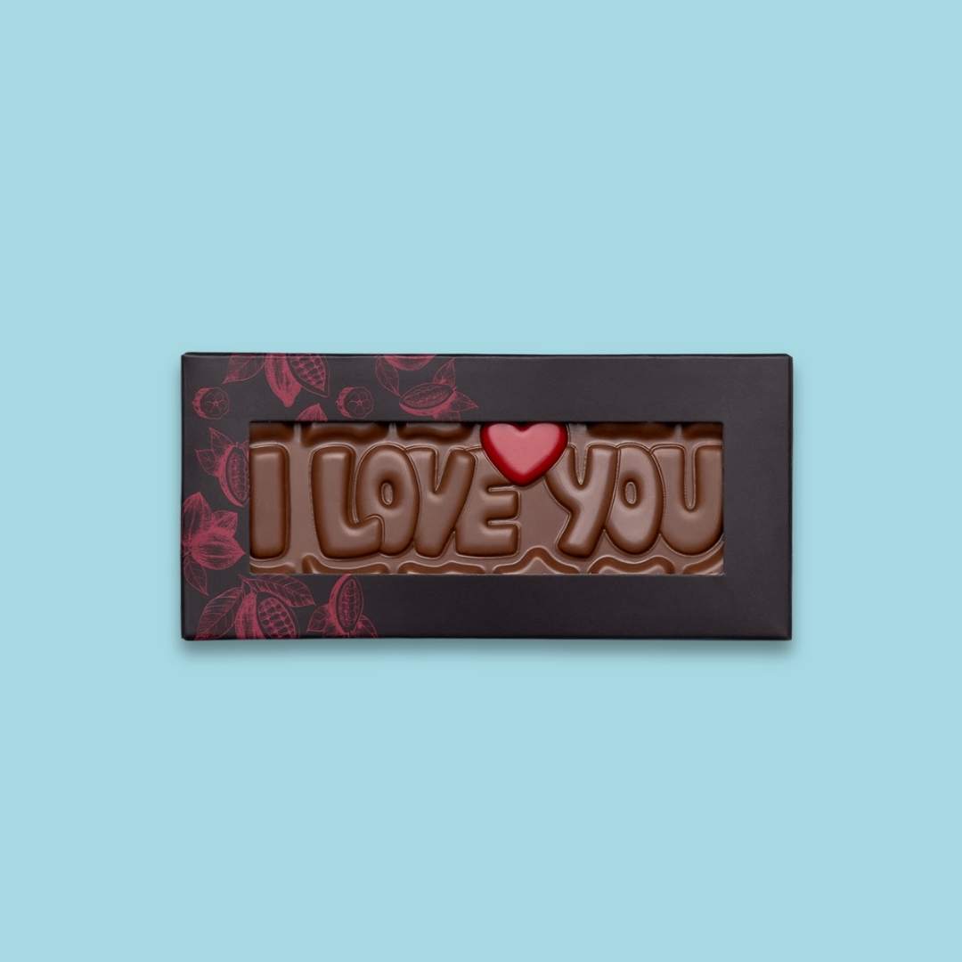 Denne sjokoladeplaten er laget av vår smakfulle Sjokoladefryd melkesjokolade, og dekorert med teksten “I love you” og et håndmalt hjerte. En kombinasjon av ekte håndverk og varme følelser – formidlet i sjokolade.
