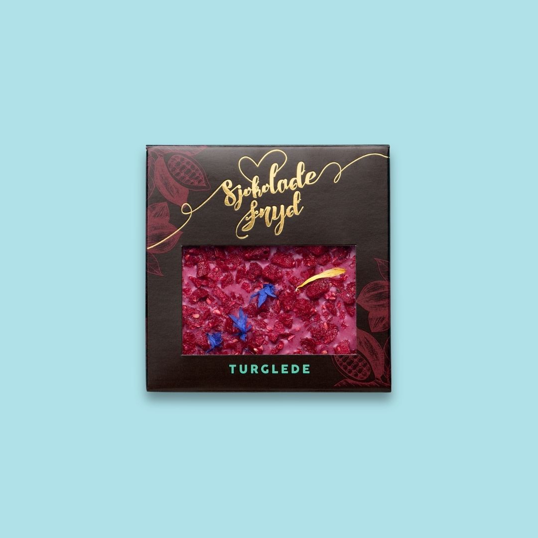 Turglede sjokoladeplate med hvit sjokolade smaksatt med friske og syrlige bringebær. Et nydelig lite mellommåltid som gir ekstra energi og påfyll på små og store turopplevelser.